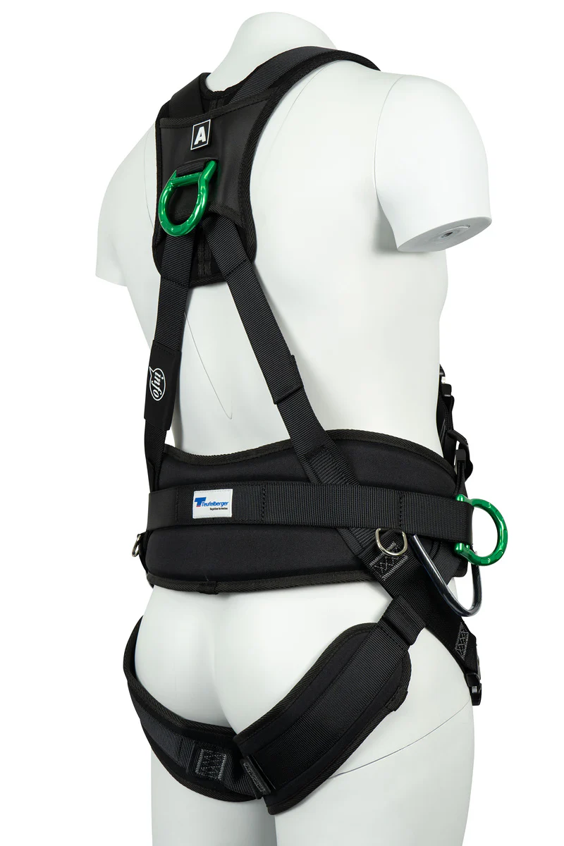 - 4 gröna fästpunkter: Viktbar rygg-D-ring (fallstopp), 2 vikbara laterala D-ringar (positionering och restraint), sternal fästpunkt (fallstopp).