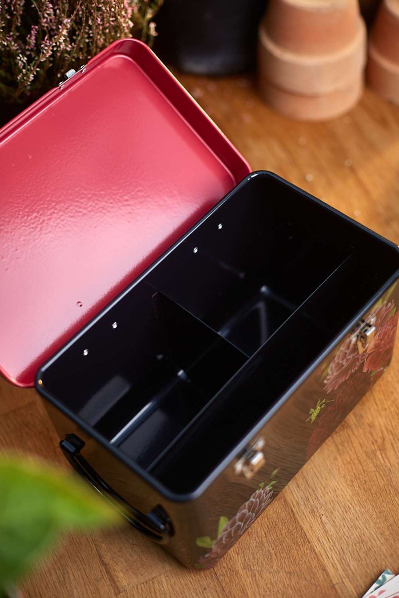 Invändigt finns tre separata fack som hjälper dig att hålla ordning på fröerna. Ett av facken löper till och med på längden, så att även de största fröpåsarna får plats. Två kraftiga metallspännen håller det gångjärnsförsedda locket säkert stängt under förvaring.