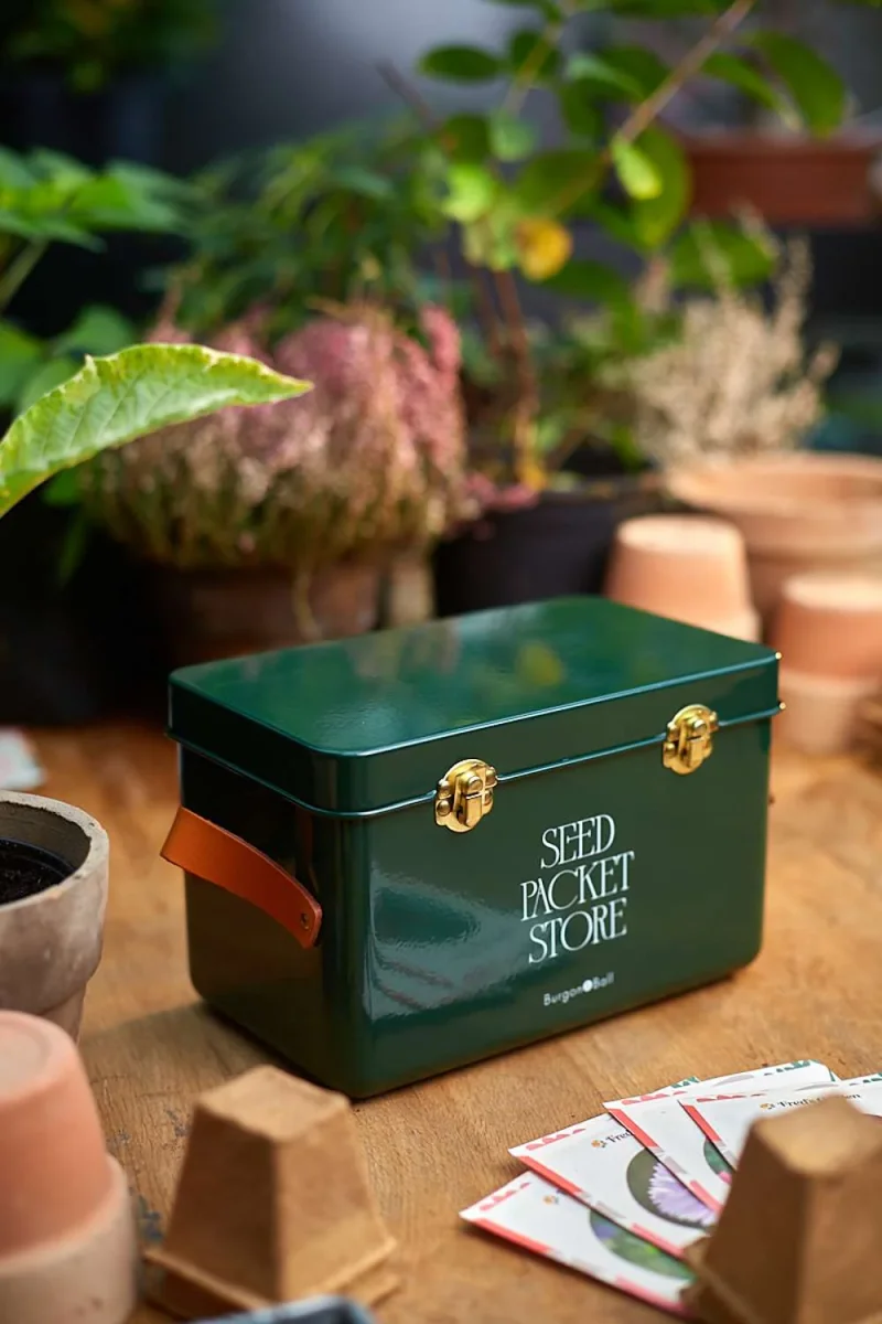 Men förutom att vara vacker är denna fröburk också mycket praktisk. Två starka metallspännen håller det gångjärnsförsedda locket säkert stängt, och inuti finns tre separata fack som gör det enkelt att organisera fröna redo för sådd. Ett av facken löper till och med på längden, så att även de största fröpåsarna får plats. Medföljande månadskort hjälper dig att hålla koll på när dina frön ska sås.