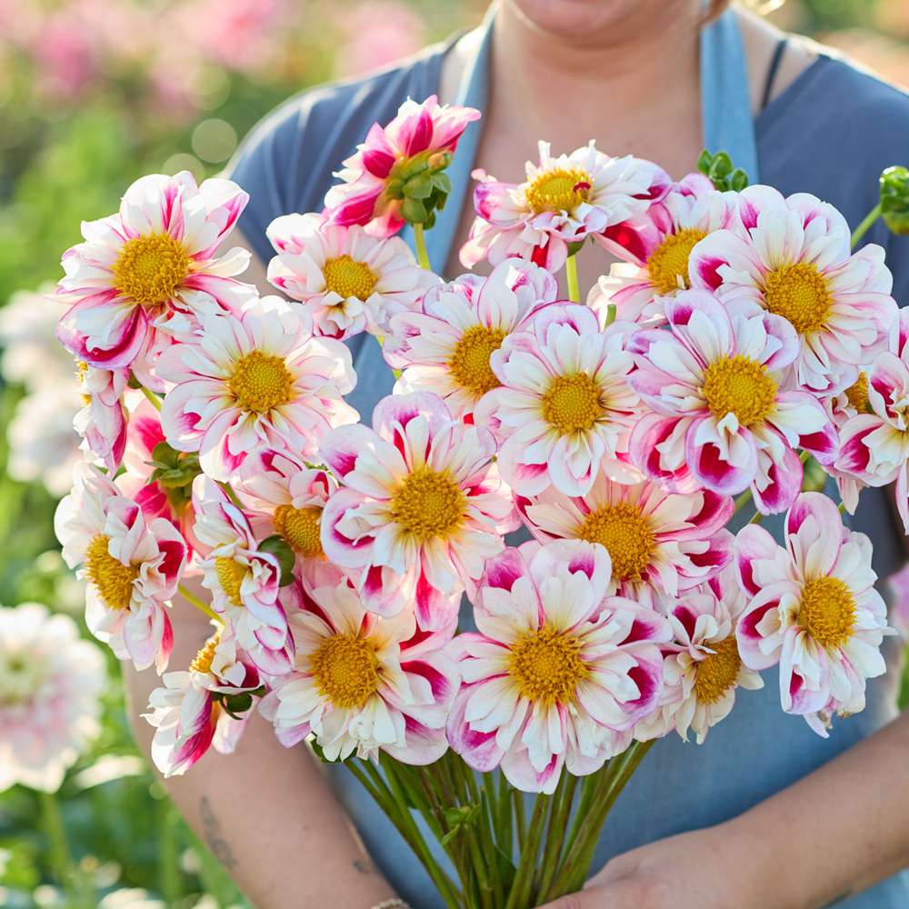 En sann glädjespridare för din trädgård. Inte bara för dig själv, utan även fjärilar och bin kommer att älska denna stora enkelblommande dahlia. Bumble Rumbles vackra utseende gör den till ett absolut blickfång. Blommorna blir 10-14 cm stora och växten är 60-90 cm lång. Liksom de flesta dahlior är den lämplig som snittblomma och håller länge i buketter.