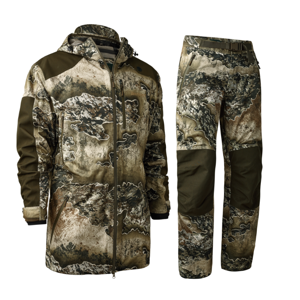 Regnstället finns i Art Green och Realtree EXCAPE™ kamouflage. Det finns i flera storlekar – se Deerhunters storleksguide för korrekt passform.