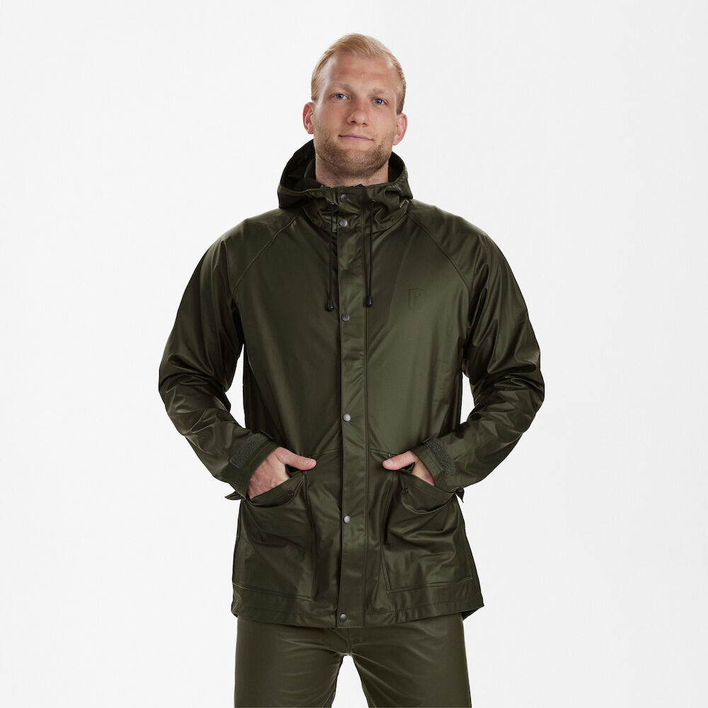 Regnjackan finns i Art Green och i flera storlekar – se Deerhunters storleksguide för att hitta rätt passform.
