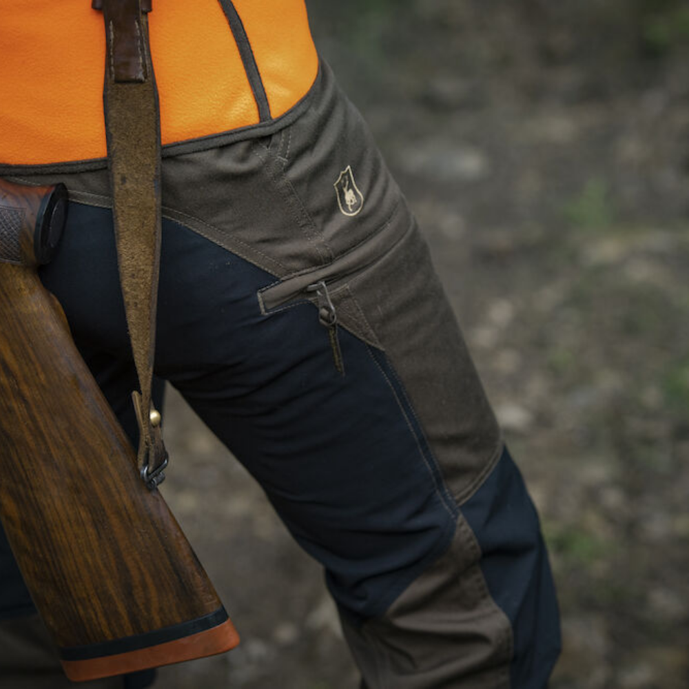 - Förstärkt benslut: Extra slitstyrka längst ner, där byxorna möter snår och kängkanten.