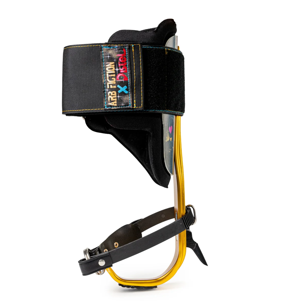 Född ur samarbetet mellan Distel och Arbfiction är detta en sann höjdpunkt – en exklusiv design i guld och turkos kombinerad med kompromisslös ingenjörskonst. Smidd av DMM i Wales, försedd med helt nytt spärrbandssystem: en klättersporre som verkligen syns – djärv, högljudd och unik.