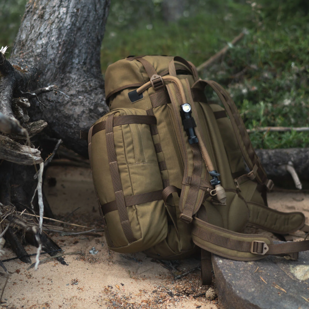 Axelremmarna följer kroppen och kan justeras snabbt. Höftbältet fördelar vikten och avlastar axlarna. Det gör stor skillnad under långa vandringar, patruller och jaktdagar.