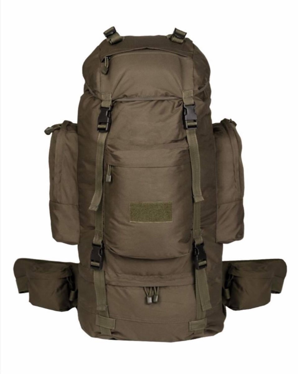 En justerbar och delvis vadderad rem finns också runt höfterna, som öppnas med en fastex-klämma. Det är värt att nämna att den nedre delen av ryggen har en integrerad del av vadderingen. Ryggsäcken har också extra remmar i toppen och botten. Ryggsäcken erbjuder en stor mängd bärutrymme och är perfekt för både militär och camping och vandring.