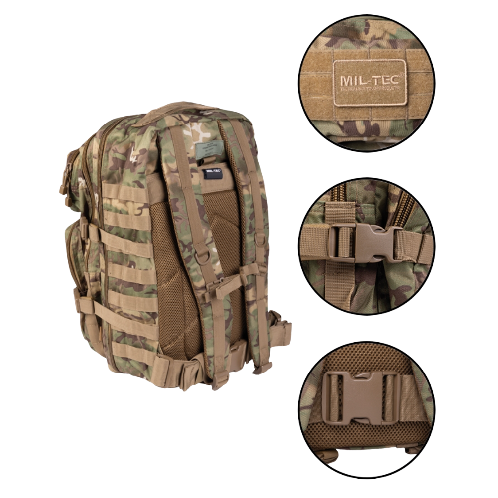 Vill du göra väskan mer personlig? Fäst kardborremärken på framsidan. Skydda innehållet med ett regnskydd för ryggsäckar i regnigt väder. Dessutom kan en vattenflaskhållare från Mil-Tec monteras via MOLLE-systemet.